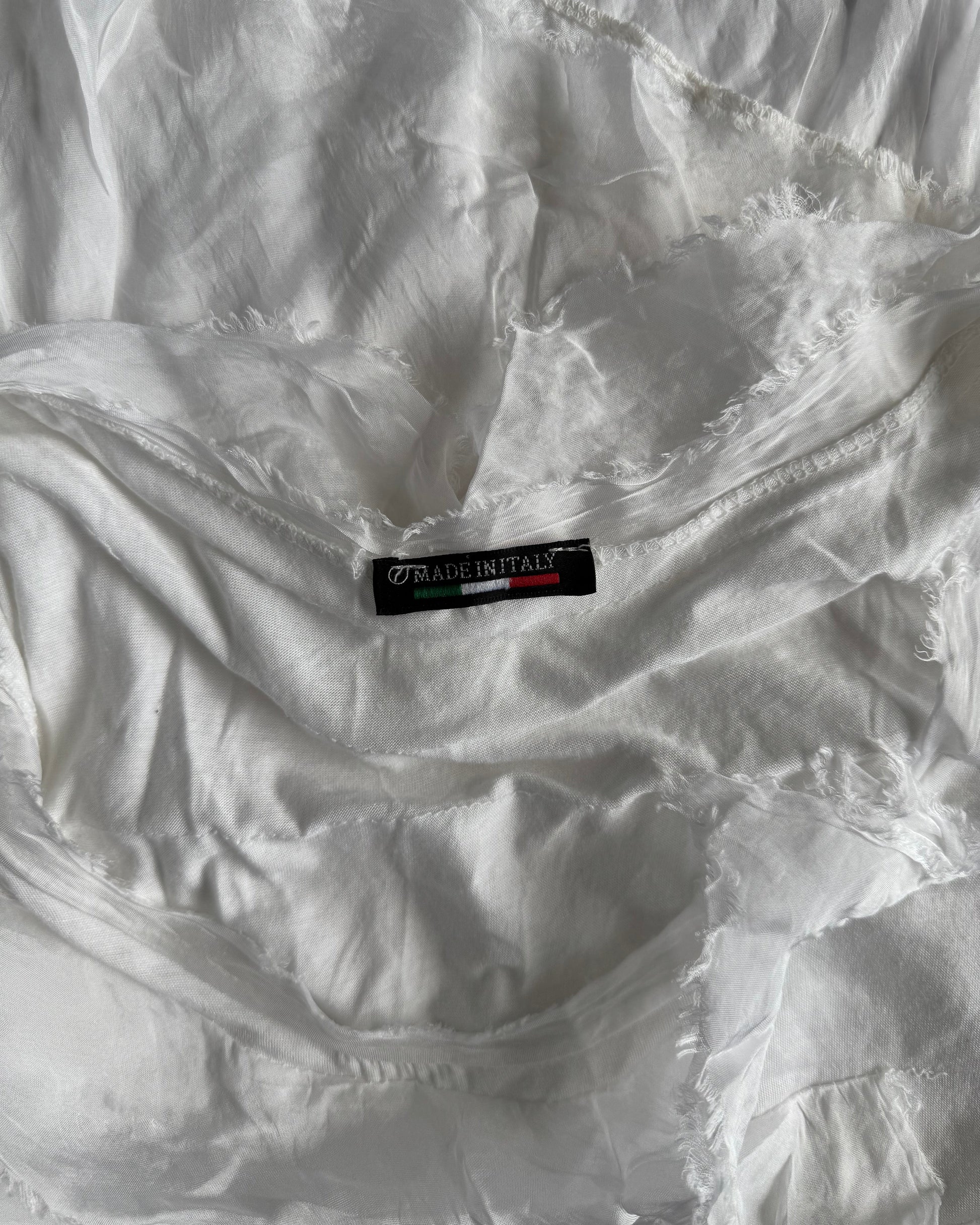 Adelyn is wearing an asymmetrical top with ruffles. Made in Italy. No size tag available. Suits size M/L depending on desired fit. Has stretch.