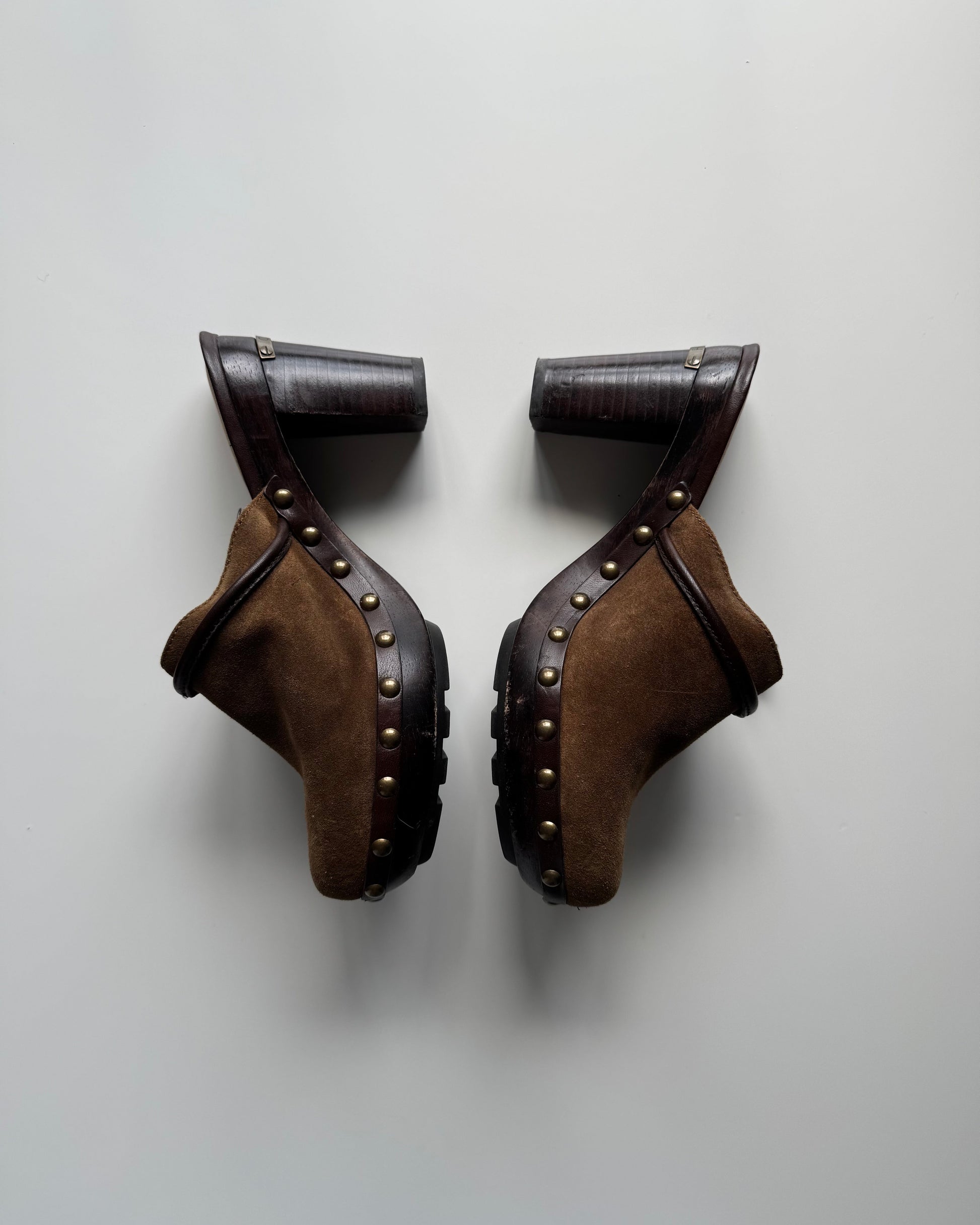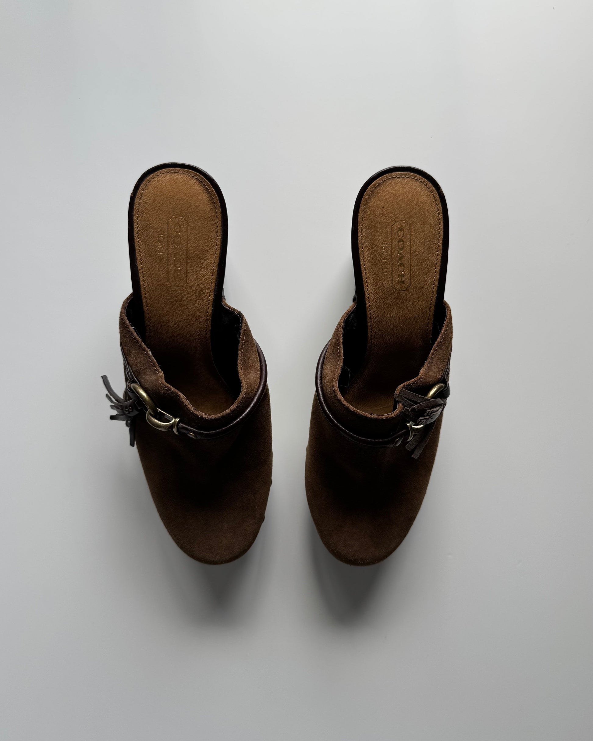 Suede Coach clogs. Marked size 7.5. Slight flaw on heel block (pictured).