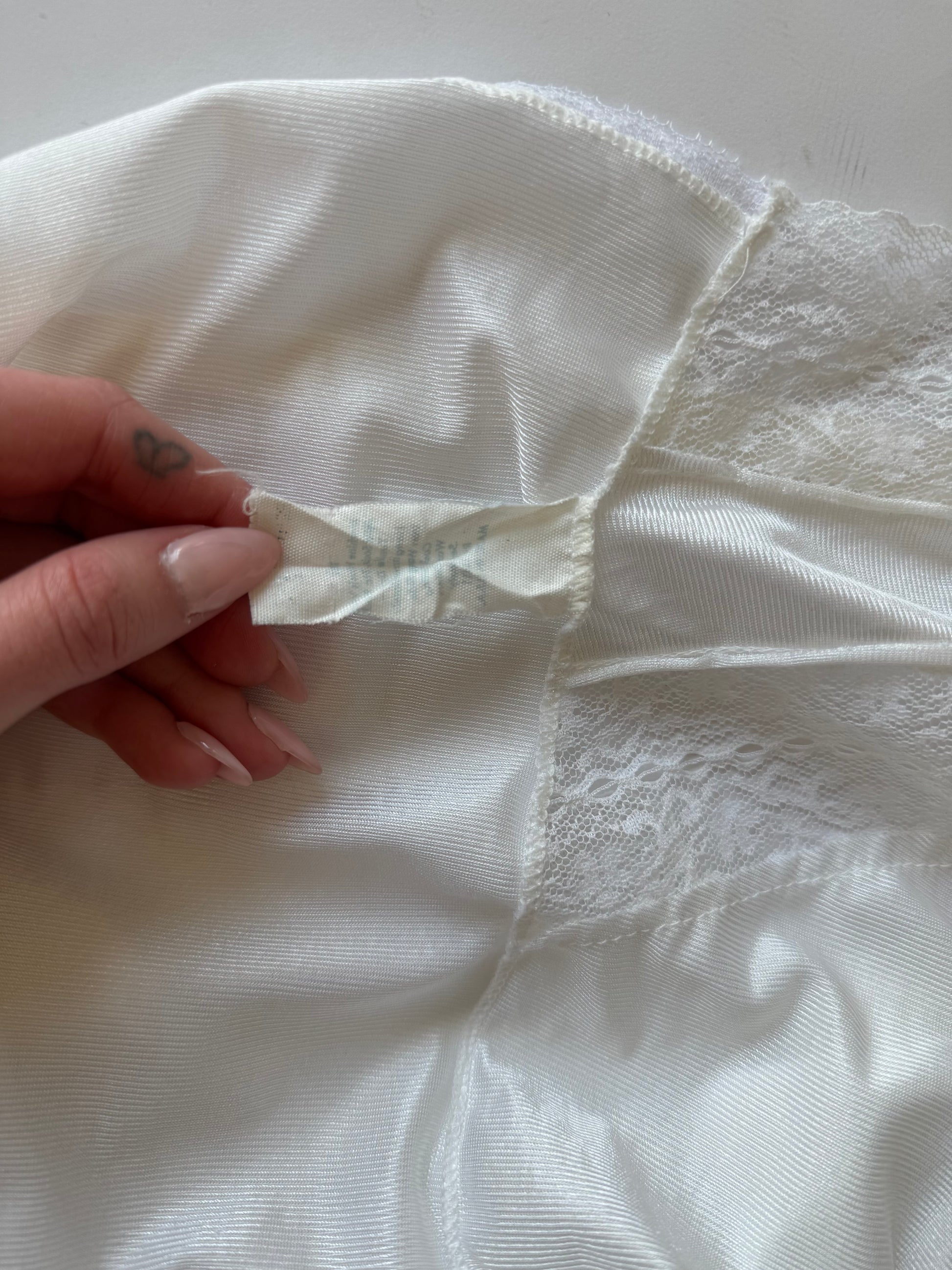 Adelyn is wearing a vintage camisole with lace detailing. Sizing unmarked. Estimated size S. Best suited for S. Can suit M depending on bust size.