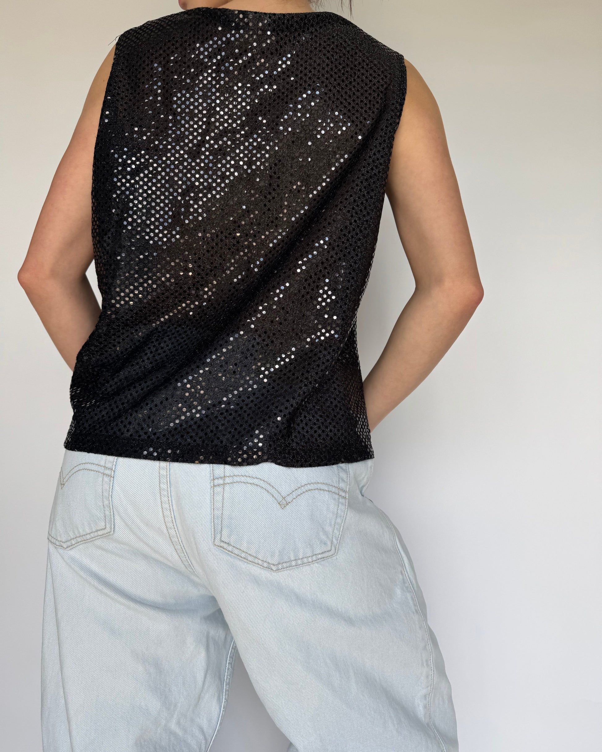 Adelyn is wearing a vintage notations sheer, sparkly tank. Marked size S, best suited for S/M.